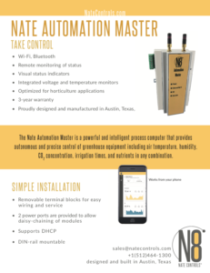 Nate provides two unique controller modules: An Automation Master and a Relay Output Module. The Automation Master is the process computer that executes recipes and manages communication with sensors, grow lights, the cloud, and one or more Relay Output Modules. The Relay Output Modules provide the hardware interface to control greenhouse equipment.