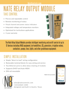 The Nate Relay Output Module provides intelligent monitoring and on/off control of up to 12 devices including HVAC equipment, de-humidifiers, CO2 generators, irrigation valves, contactors, pumps, fans, lights, and other greenhouse equipment. It uses wired Ethernet for fast, reliable control and ease of installation.