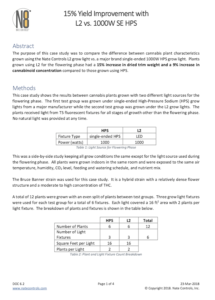 The purpose of this case study was to compare the difference between cannabis plant characteristics grown using the Nate Controls L2 grow light vs. a major brand single‐ended 1000W HPS grow light. Plants grown using L2 for the flowering phase had a 15% increase in dried trim weight and a 9% increase in cannabinoid concentration compared to those grown using HPS.
